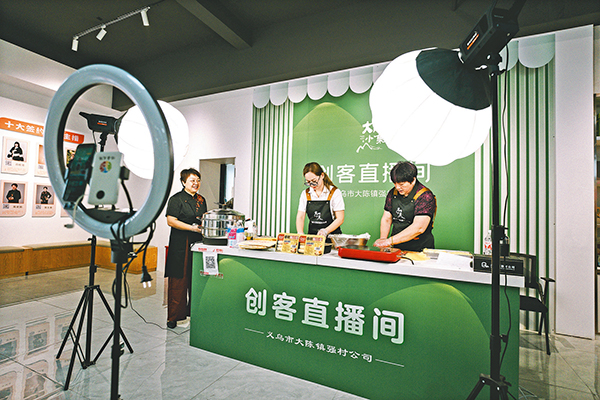 尤為引人注目的是,工坊一角的“創(chuàng)客直播間”時(shí)不時(shí)就會(huì)飄出陣陣香氣。主播在直播間里現(xiàn)場制作紅粿、響鈴卷等美食,詳細(xì)講解制作過程和特色風(fēng)味,引得線上線下觀眾移不開“腳步”。據(jù)悉,“大陳小集”共富工坊依托義烏本地電商資源優(yōu)勢,與多個(gè)電商平臺(tái)建立供需合作,開設(shè)線上商城,進(jìn)一步拓寬農(nóng)產(chǎn)品銷售渠道。至今,共富工坊已成功舉辦上百場直播培訓(xùn),建立了12個(gè)共享直播間,持續(xù)推動(dòng)助農(nóng)直播活動(dòng),線上產(chǎn)品銷售額已累計(jì)突破1000萬元,進(jìn)一步強(qiáng)化產(chǎn)業(yè)鏈的發(fā)展。