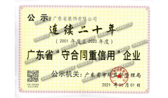 祝贺广东省装饰有限公司在2021年6月1日荣获由广东省市场监督管理局颁发的“广东省守合同重信用企业证书”。 同时广东省装饰有限公司一直保持着从2001年度至2020年度连续二十年荣获该奖项。今后我司将再接再厉,继续做好行业中的企业榜样。