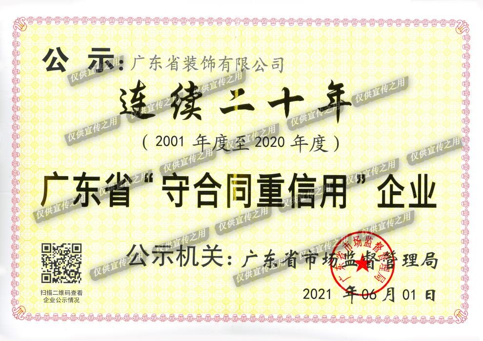 祝贺广东省装饰有限公司在2021年6月1日荣获由广东省市场监督管理局颁发的“广东省守合同重信用企业证书”。 同时广东省装饰有限公司一直保持着从2001年度至2020年度连续二十年荣获该奖项。今后我司将再接再厉,继续做好行业中的企业榜样。