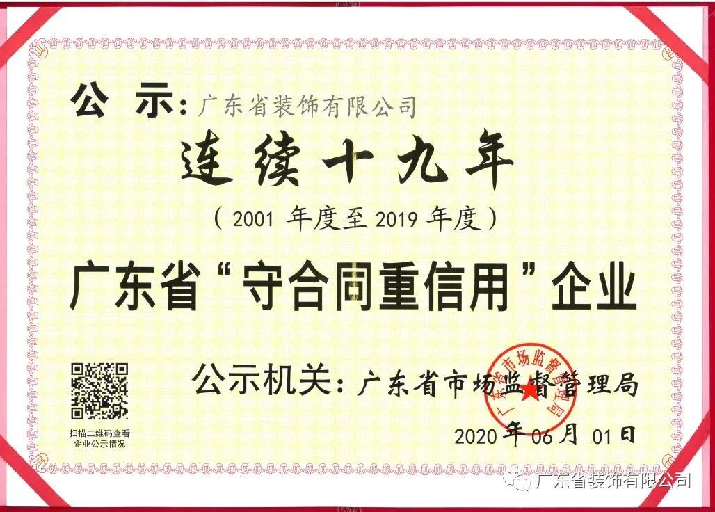 祝贺广东省装饰有限公司在2020年6月1日荣获由广东省市场监督管理局颁发的“广东省守合同重信用企业证书”。