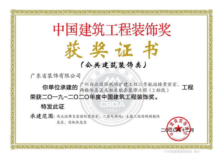广东省装饰有限公司承建的广州白云国际机场扩建工程二号航站楼贵宾室、两舱休息区及相关配套装修工程(2标段)工程荣获2019-2020年度中国建筑工程装饰奖。