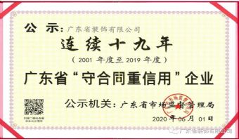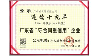 近期,由广东省工商行政管理局组织开展2019年度广东省“守合同重信用”企业评选活动圆满结束。广东省装饰有限公司凭借科学的信用建设体系以及良好的诚信经营形象,被授予 “连续十九年(2001年度-2019年度)广东省守合同重信用企业”荣誉。