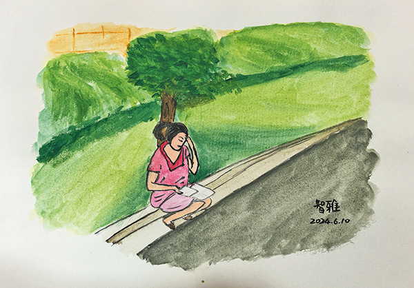 在一疊作品中,一張“簡(jiǎn)單”的漫畫(huà)吸引了大家的目光。在一棵大樹(shù)下,一名護(hù)理員一手翻著書(shū),一手扶著額頭,狀態(tài)宛若大考前的學(xué)子。畫(huà)作的主角是來(lái)自云南的竇阿姨,今年五十多歲,是一名老護(hù)理員?!案]阿姨只上過(guò)半年學(xué),大字不識(shí)幾個(gè)。護(hù)理證考試時(shí),她竟然都通過(guò)了,理論知識(shí)部分甚至拿到了95分的高分。很多人對(duì)此感到不可思議,其實(shí),這幅漫畫(huà)就是‘謎底’?!?陳智雅解釋說(shuō),畫(huà)面中的“書(shū)”不是日常的紙張,而是一張張硬紙殼。為了記住理論知識(shí),竇阿姨付出了十倍的努力——每天戴著耳機(jī)一遍又一遍聽(tīng)語(yǔ)音考題,把每道考題和答案里認(rèn)識(shí)的字都寫(xiě)下來(lái),考試時(shí)憑借這些“熟面孔”還原考題,選擇早已爛熟的答案。