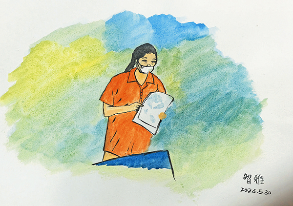 在康養(yǎng)中心160多名員工中,像竇阿姨一樣勤奮努力的養(yǎng)老人還有不少。陳智雅的畫(huà)作還定格了另一位來(lái)自湖南的倪阿姨——她站在床邊,雙眼盯著前方,雙手拿著厚厚一疊筆記?!斑@一幕發(fā)生在一次全市護(hù)理員競(jìng)賽前夕?!标愔茄沤榻B,倪阿姨學(xué)習(xí)操作技能時(shí)特別認(rèn)真,手里的筆刷刷地寫(xiě)個(gè)不停,筆記寫(xiě)滿(mǎn)了六頁(yè)紙,每一個(gè)步驟和注意事項(xiàng)都記得格外詳細(xì)。功夫不負(fù)有心人,在當(dāng)年的競(jìng)賽中,倪阿姨取得了全市第五名的好成績(jī)。