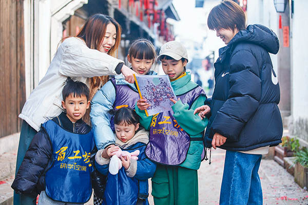 老街的華麗變身,還吸引不少年輕人來村里創(chuàng)業(yè)。1月12日下午,在倍磊老街上,“百工坊”倍磊店負(fù)責(zé)人周媛媛正耐心地教導(dǎo)前來研學(xué)的學(xué)生染印花布。“以前我在李祖老街、尚陽老街都辦過類似的研學(xué)項(xiàng)目。但我覺得,還是倍磊村的歷史文化底蘊(yùn)更為深厚?!敝苕骆抡f,一個(gè)偶然的機(jī)會(huì),她到倍磊村游玩,一眼就看中了現(xiàn)在這個(gè)地方,當(dāng)即決定留下來。