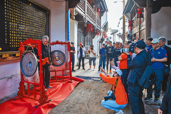 記者在倍磊街中心位置看到,經(jīng)過修繕,古香古色的街心亭、街心殿重新屹立在倍磊老街上。“街心亭修繕后,原本已丟掉的‘撞銅鑼’非遺活動(dòng)也重新興了起來?!标惻d海告訴記者,“撞銅鑼”是朝拜俞大官特有的民俗儀式,街心亭內(nèi)放有兩面銅鑼,敲銅鑼者站在中間,手持一個(gè)鑼槌,左鑼敲一槌,右鑼敲一槌,稱之為“撞銅鑼”。