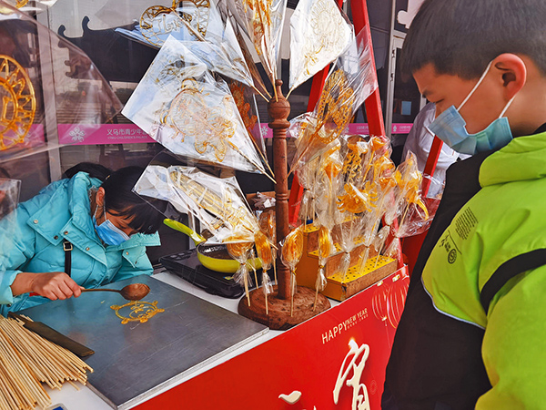 主舞臺(tái)對(duì)面是手工作坊區(qū),一群小朋友圍在捏面人處,正在欣賞非遺傳承人做冬奧會(huì)吉祥物“冰墩墩”。據(jù)史料記載,我國(guó)的捏面人早在漢代就已有文字記載,經(jīng)過(guò)幾千年的傳承和經(jīng)營(yíng),已是中國(guó)文化和民間藝術(shù)的一部分?!安粌H讓孩子們感受中華傳統(tǒng)文化的魅力,同時(shí)用手工創(chuàng)作的方式表達(dá)了對(duì)北京冬奧會(huì)的美好祝福,為北京冬奧會(huì)的運(yùn)動(dòng)健兒加油助力?!笔形幕^相關(guān)負(fù)責(zé)人介紹,這次節(jié)日活動(dòng)中還安排了義烏剪紙、泥塑、竹編、傳統(tǒng)喜慶掛件制作技藝等項(xiàng)目進(jìn)行依次展示,讓大家近距離欣賞傳統(tǒng)文化的魅力,讓民俗文化的“活化石”綻放光彩。
