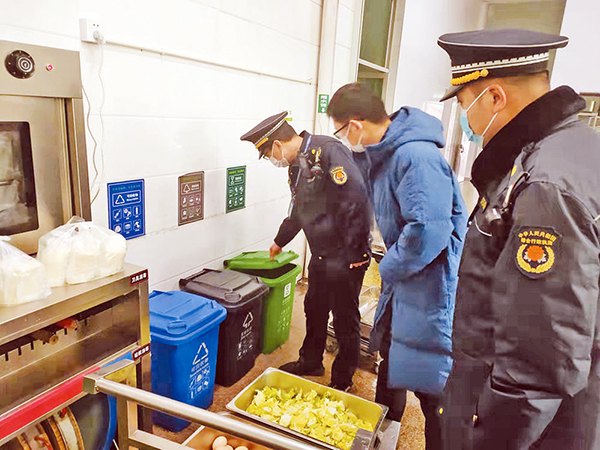執(zhí)法人員檢查校園食堂垃圾分類情況。