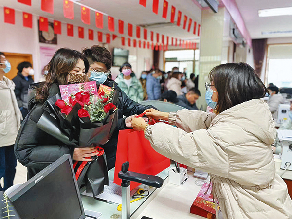 記者從市民政局婚姻登記中心獲悉,2月22日當(dāng)天的婚姻登記預(yù)約量達(dá)115對(duì),是日常預(yù)約量的3倍。全天共辦理婚姻登記165對(duì)。