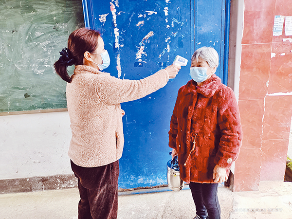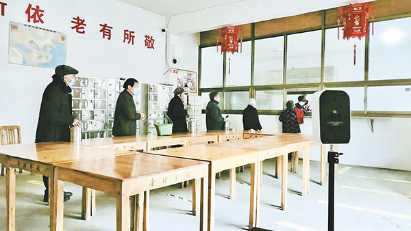居家養(yǎng)老中心工作人員為老人測溫。