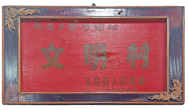 1985年,義烏縣人民政府給吳店鄉(xiāng)苦竹塘村頒發(fā)了“文明村”榮譽(yù)稱號(hào)。這塊紅底、木框的榮譽(yù)牌匾至今懸掛于文化禮堂內(nèi)。