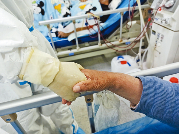 除了血液透析之外,毛卓英護(hù)士長(zhǎng)等一些技術(shù)嫻熟的“精兵”們,更是要進(jìn)入該院區(qū)的隔離病房為特殊患者提供必要的穿刺操作、CRRT治療等。在他們的努力下,兩周以來(lái),浙江醫(yī)療隊(duì)所接管的血透室治療工作都已進(jìn)入正軌,24小時(shí)接連不斷的透析治療,終于讓需要的患者及時(shí)做上透析,獲得了生命質(zhì)量的延續(xù)。