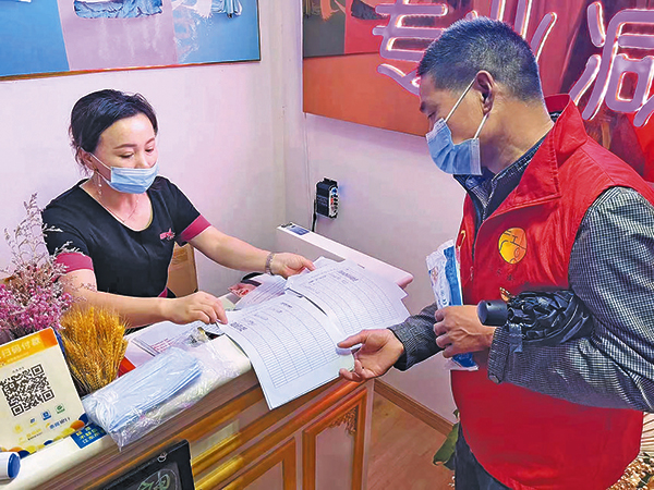 “紅色樓長(zhǎng)”(右)正在查看轄區(qū)經(jīng)營(yíng)戶疫情防控措施落實(shí)情況