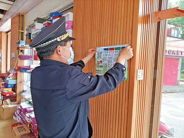 工作人員在店鋪張貼垃圾分類宣傳頁。