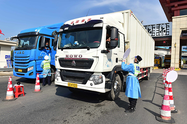 杭金衢高速望道出口,現(xiàn)場工作人員對下高速車輛的司機進行掃碼、測溫、詢問出行路線等查驗。