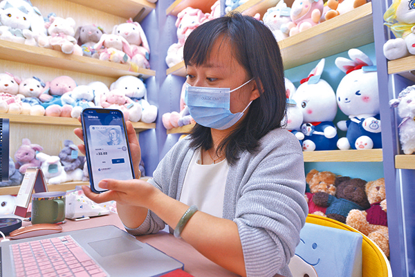 圖為市場經(jīng)營戶王秋婷展示顧客購買商品后支付的數(shù)字人民幣。(吳峰宇)