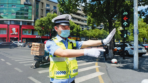 “電動車往輔道這邊開,不要占用機(jī)動車道行駛?!薄邦^盔戴好,注意安全?!苯?0攝氏度的高溫下,市公安局交警大隊(duì)稠江中隊(duì)副中隊(duì)長柯平身穿短袖制服、戴著白色手套,一刻不停地在路口進(jìn)行糾違、交通勸導(dǎo)、事故處理。