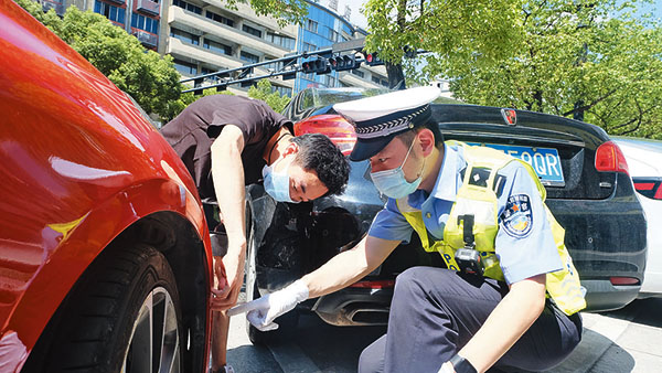 此時(shí),一輛停在店門前停車位上的小轎車正在倒車,說時(shí)遲那時(shí)快,小轎車方向一轉(zhuǎn),刮擦了停在右側(cè)的另一輛車?!巴R幌拢惆褎e人的車刮了,先下車?!弊鳛榻痪目缕?,見證了這起事故的全過程。還沒休息幾分鐘,柯平又一頭扎入烈日下,開始處理這起交通事故。
