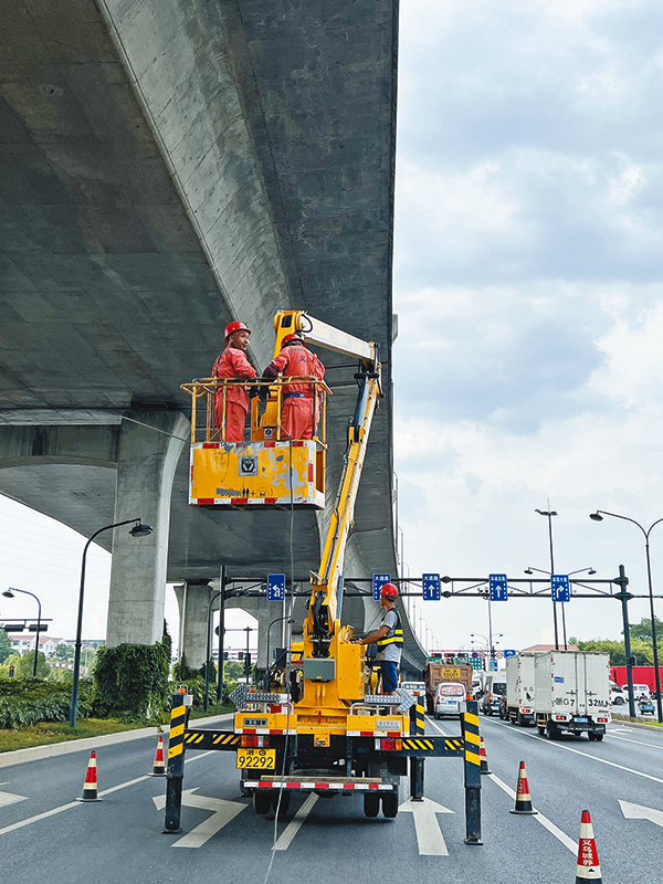工人在高空作業(yè)養(yǎng)護高架橋。