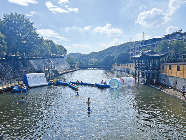 天然清澈的優(yōu)質(zhì)水源從八都水庫(kù)大壩底下流出,流經(jīng)的第一村便是上坑仁村。該村依托優(yōu)質(zhì)水資源,在大壩腳下建了一個(gè)天然的嬉水綜合體?!罢麄€(gè)水上樂(lè)園項(xiàng)目分為兩個(gè)標(biāo)段,其中一標(biāo)段建設(shè)內(nèi)容包括堰壩、流水臺(tái)、水上棧道、河底改造、小木屋、淋浴房等,總投資約220萬(wàn)元,目前已基本完成;二標(biāo)段將河底改造2290平方米,河兩岸提升260米以及亮化、路面改造等,總投資約320萬(wàn)元?!睒怯烙兄钢呀?jīng)投入使用的嬉水綜合體介紹,“這里是近3000方的泳池,泳池底部鋪上了鵝卵石,深度從0.7米到1.3米,分為淺水區(qū)和深水區(qū),適合不同人群暢快游泳。這里還設(shè)有滑梯、滾筒等水上游樂(lè)設(shè)施,讓大家感受‘花樣’戲水的樂(lè)趣?!?/div>