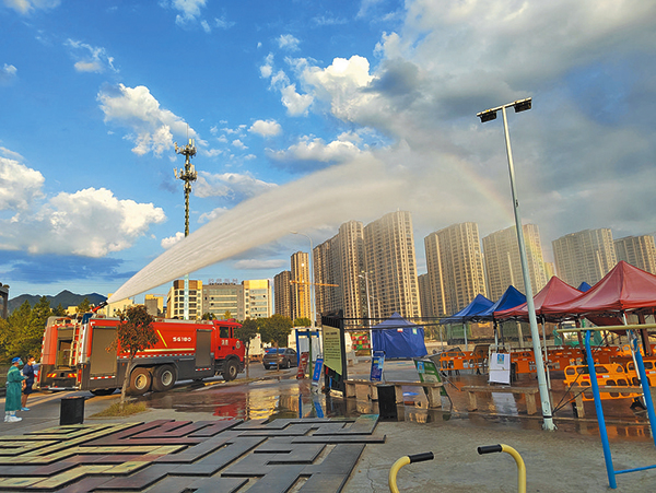 持續(xù)高溫天氣,給核酸采樣工作帶來了不小的挑戰(zhàn)。連日來,蘇溪鎮(zhèn)專職消防隊組建了志愿服務(wù)小分隊,每天為全鎮(zhèn)100余個核酸采樣點(diǎn)灑水降溫,為一線醫(yī)務(wù)人員開展防疫工作“保駕護(hù)航”。(駱紅婷 宗琳玲 段靜飛)