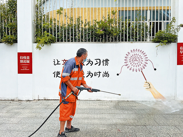 連日來,義烏市環(huán)境集團開展校園周邊環(huán)境衛(wèi)生集中提升行動,為廣大師生營造一個整潔、舒適的學習生活環(huán)境。圖為環(huán)衛(wèi)工人在學校周邊進行衛(wèi)生保潔。(林曉燕)