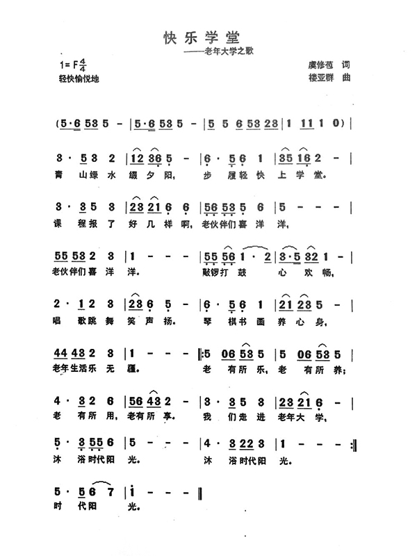“青山綠水綴夕陽,步履輕快上學(xué)堂……”日前,《快樂學(xué)堂》在廿三里養(yǎng)老服務(wù)中心唱響。在場(chǎng)的觀眾們跟著昂揚(yáng)的韻律和節(jié)奏拍手,一片歡騰。這是我市第一首自編自導(dǎo)自唱的老年大學(xué)校歌,歌詞出自虞修苞之手。