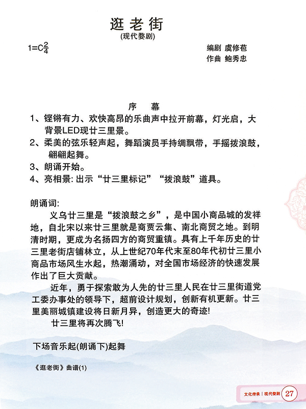 當(dāng)被問及為何會(huì)編寫婺劇現(xiàn)代戲《逛老街》時(shí),虞修苞的話匣子一下打開了。“婺劇現(xiàn)代戲《逛老街》是為獻(xiàn)禮建黨百年而創(chuàng)作的,根據(jù)廿三里街道編寫的《廿三里老街》一書改編。”他介紹,該劇從劇本創(chuàng)作到排演,歷時(shí)半年,共分七大場(chǎng)景,包括序幕《雞毛換糖》、第二場(chǎng)《廿三里由來》、第三場(chǎng)《老街概況》、第四場(chǎng)《星羅密布的商鋪》、第五場(chǎng)《傳統(tǒng)手工藝再現(xiàn)》、第六場(chǎng)《市場(chǎng)變遷》、第七場(chǎng)《落幕》等章節(jié)。