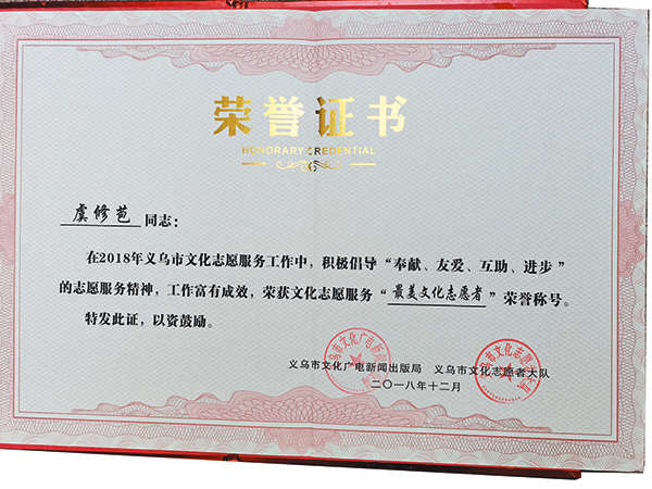 與此同時(shí),他一直參加文化演出志愿服務(wù),還成立了廿三里快樂藝術(shù)團(tuán),2018年為各村(居)公益演出30余場(chǎng)。為此,他被義烏市文廣新局授予“最美文化志愿者”稱號(hào),該藝術(shù)團(tuán)也被評(píng)為“義烏市十佳藝術(shù)團(tuán)體”。