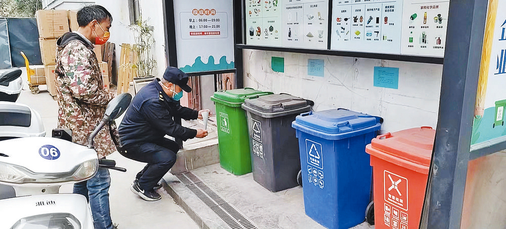 執(zhí)法隊員檢查企業(yè)生活垃圾投放點情況。