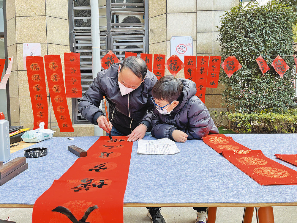 當(dāng)日,轄區(qū)書法愛好者早早來(lái)到永祥社區(qū)黨群服務(wù)中心,在方桌上鋪紙架硯、調(diào)墨潤(rùn)筆、揮毫潑墨。不一會(huì),一副副寫滿新春祝福的楹聯(lián)躍然紙上?!坝灿河毁F,接財(cái)接福接平安”“高居寶地財(cái)興旺,一帆風(fēng)順吉星照”……紅彤彤的紙上,行書、楷書、草書等字體各顯神韻,飄著墨香,帶來(lái)濃濃的年味。