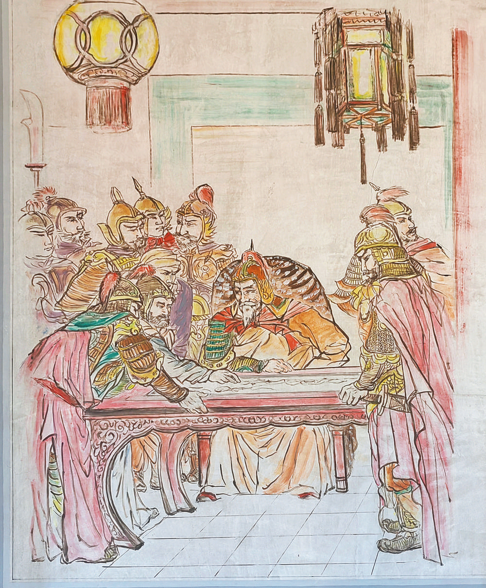 跨過臺階,進(jìn)入前廳,這里擺放著宗澤的相關(guān)資料,墻上或以文字或以彩繪或以詩文記錄了宗澤生平以及抗金勤王、東京保衛(wèi)戰(zhàn)等偉業(yè)。第二進(jìn)是廳堂,俗稱議事廳,堂內(nèi)懸掛著康熙帝賜的“忠藎永昭”、乾隆帝賜的“丹忱貫日”牌匾以及宗族后裔的題詞。最后面是里廳,廳頭上高懸岳飛的題詞“盡忠報國”,廳內(nèi)擺放著宗澤公的銅像,兩邊墻上分別繪有其妻子、兒子的畫像。