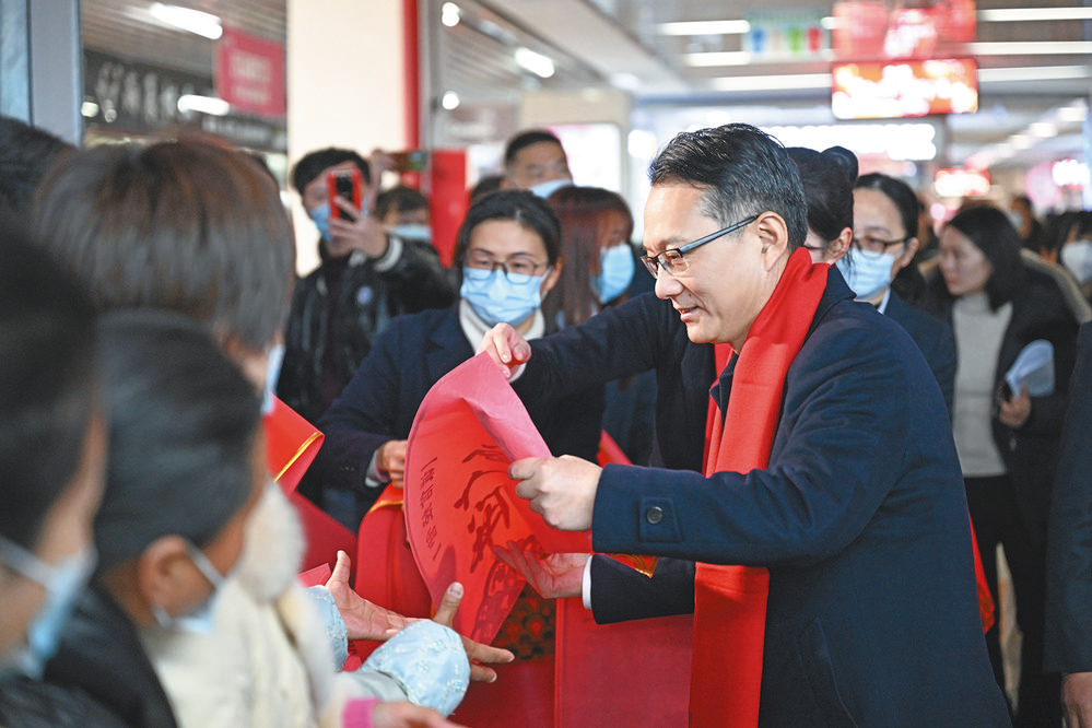 “大家來接‘?!玻 币荒曛?jì)始于春,節(jié)后開市經(jīng)營戶們都想討個彩頭,希望為新的一年帶來好運(yùn)。每到一處,熱情的市場經(jīng)營戶都把市領(lǐng)導(dǎo)一行重重“包圍”,有的想得到一副生意興隆的春聯(lián),有的被熱鬧場景感染想一睹為快,有的“貪心”地想多要幾張?!伴_業(yè)大吉、財(cái)源廣進(jìn)、生意興隆,每副春聯(lián)意義都不同,我這是在收集‘敬業(yè)?!!苯?jīng)營戶的一句話引來更多的歡聲笑語,現(xiàn)場氣氛輕松熱烈。