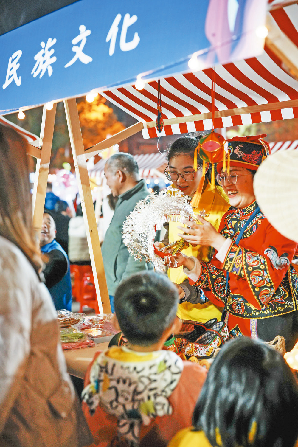 剪紙藝人一手握剪刀,一手拿紅紙,轉(zhuǎn)眼間一只“蝴蝶”躍然手上;幾經(jīng)捏、搓、揉、掀,用小刀靈巧地點(diǎn)、切、刻、劃,精巧靈活的面人呈現(xiàn)眼前……“彩虹集市”的非遺文化展示攤位吸引了孩子們的目光?!疤氐貛Ш⒆舆^來,現(xiàn)場感受一下傳統(tǒng)文化的魅力。”居民陳女士說?!拔沂峭良易鍧M付英,歡迎來到‘同心四季’直播間,今晚帶大家‘云游’集市……”社區(qū)主播滿付英帶著網(wǎng)友探尋每個(gè)攤位。在民族文化攤點(diǎn),仫佬族韋琳身著民族服飾,向居民熱情洋溢地介紹民族特色產(chǎn)品,推廣民族文化。