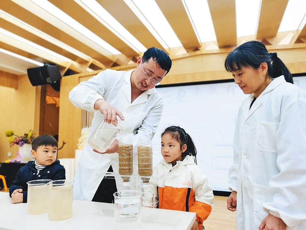圖為志愿者現(xiàn)場教小朋友做凈水實(shí)驗(yàn)。(張?jiān)骑w 方笑娟)