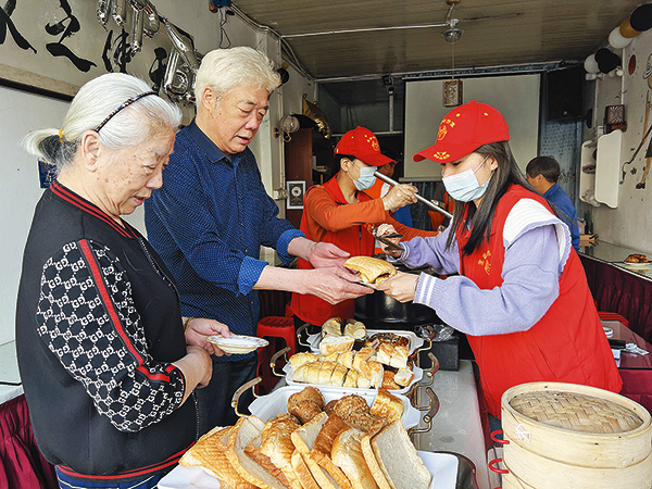 “味道可好嘍!”來自河南商丘的周大叔是一名環(huán)衛(wèi)工人,日常負(fù)責(zé)化工路一段的清掃工作,他邊吃著早餐,邊豎起大拇指感嘆道:“你看,我拿了豆?jié){、包子、油條,早餐上這兒來吃,一個(gè)月能省下不少錢!”與朱剛的經(jīng)歷相似,除了是愛心公益早餐的“受益者”,周大叔也是該活動(dòng)的“出力者”。自從受邀到首店吃過愛心早餐后,周大叔當(dāng)即自告奮勇參與活動(dòng),工作之余便來幫忙收拾店鋪、制作面點(diǎn),“人家好心對(duì)咱,咱也要懂得回報(bào)!”