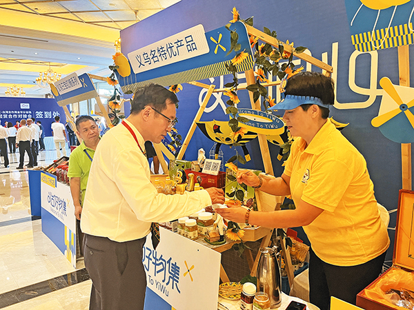 7月8日下午,作為義臺經貿合作對接會的配套活動,由市場集團承辦的義臺好物集在幸福湖國際會議中心舉行?,F場,來自臺灣和義烏的各種特產、小吃受到了與會嘉賓的一致好評。(楊歌)