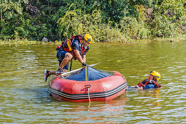 隨著一聲號(hào)令,隊(duì)員們迅速登艇。沖鋒艇像離弦的箭快速駛離岸邊,到達(dá)演練指定地點(diǎn)。隨著演練正式開(kāi)始,沖鋒艇在寬闊的河面上做環(huán)繞行駛,相繼開(kāi)展原地???、搜救、自救以及拋投救生圈。此外,隊(duì)員們還開(kāi)展了皮劃艇側(cè)翻、水上救人等項(xiàng)目演練。