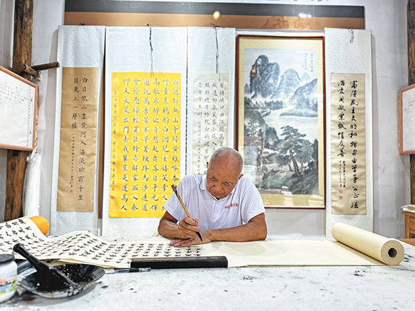 王立民利用書(shū)法特長(zhǎng)為村民服務(wù)。