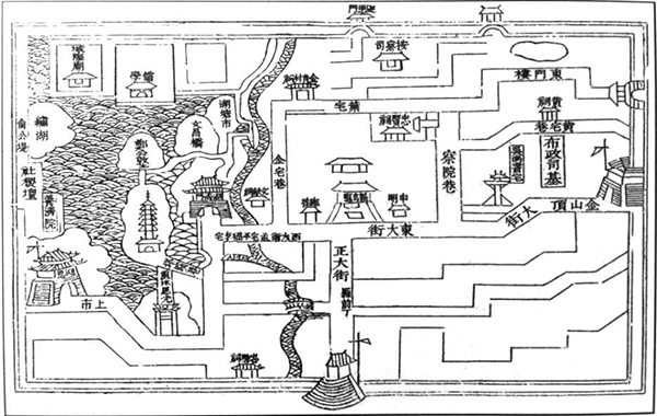 在清嘉慶《義烏縣志》中,“街”條目下,所列的街道有4條:“縣前直街(即東街)、上市街(縣西,在迎恩門內(nèi),與西街相貫)、南街(舊名下市街)、西街(湖清門內(nèi))?!倍谶@些街道中,上市街(西門街)是最繁華的一條街道。在當(dāng)時的“縣治圖”中,西門街內(nèi)有眾多的建筑:童大宗祠、旌節(jié)牌坊、育嬰堂、崇祀坊、童忠義祠、大夫第、迎恩門、養(yǎng)濟院等。