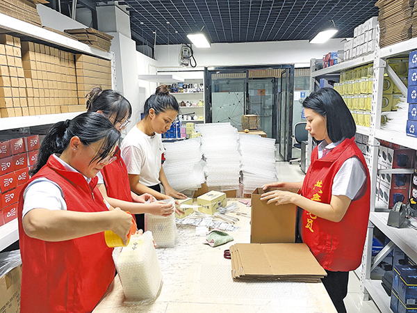 昨日,義烏市場黨員志愿者來到國際商貿(mào)城五區(qū)的網(wǎng)商服務(wù)中心,幫助電商企業(yè)打包快遞包裹。