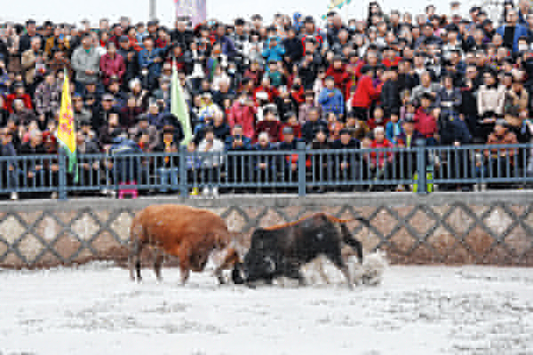 現(xiàn)場,只見兩頭斗牛頭扎彩牌、背負(fù)彩旗繞場三周,寓意風(fēng)調(diào)雨順、來年豐收。隨后,訓(xùn)練師解開繩索,斗牛便將角狠狠地頂在一起,或掛、或掃、或撞,互不讓步?!斑?!哞!”在發(fā)起幾次沖頂后,小牛“金剛掛”把比自己體型大不少的黑?!盀觚垺表?shù)寐浠亩樱磁_(tái)上頓時(shí)響起觀眾陣陣喝彩聲。