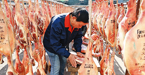 據(jù)悉,金華火腿制作技藝2008年6月被列入第二批國家級非物質(zhì)文化遺產(chǎn)名錄。它采用“兩頭烏”的兩條后腿,經(jīng)過整形、腌制、洗曬、發(fā)酵、堆疊、分級等大大小小80多道工序制作而成,傳統(tǒng)工藝制作需要10個月左右。金華火腿制作技藝非遺傳承人陸永進(jìn)介紹,現(xiàn)在是晾曬火腿的最佳時機,曬太陽對火腿的口感、品質(zhì)都有很大的幫助。(施正豪)