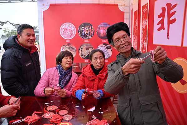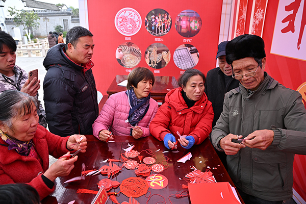 3月1日,浙江義烏市佛堂古鎮(zhèn)蒲川水街,雙江湖集團開設的“非遺工坊”小課堂上,義烏市剪紙藝術非遺代表性傳承人張志剛現(xiàn)場指導市民體驗傳統(tǒng)剪紙。