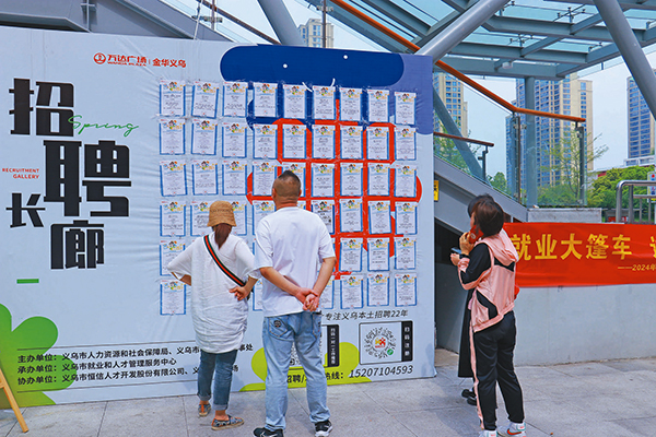 家長和求職者在招聘長廊前查看用工信息。