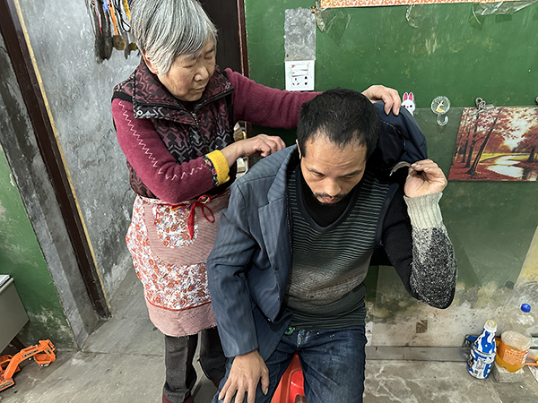 但事與愿違,2000 年一場災(zāi)難突然而至,52歲的丈夫錢新法出了意外,外出散步時(shí)突發(fā)腦溢血,雖及時(shí)進(jìn)行搶救,但還是導(dǎo)致其癱瘓?jiān)诖病W阅且院?,家里的頂梁柱一下子倒了,面?duì)突如其來的噩耗,猶如晴天霹靂。丈夫癱瘓后,生活的重?fù)?dān)全部壓在沈春仙一個(gè)人身上。
