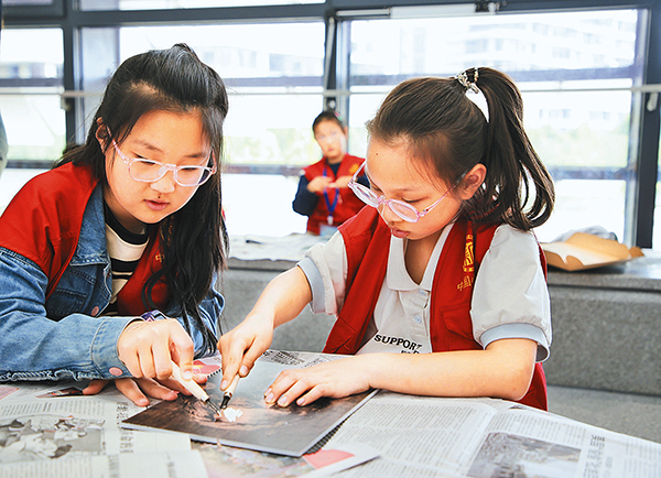 現(xiàn)場,工作人員為十余位孩子介紹《播火記》的故事背景,并指導他們雕刻制作《播火記》中的一個畫面,體驗版畫藝術(shù)的魅力。在工作人員的講解下,孩子們耐心地雕刻出自己的作品,感受傳統(tǒng)非遺文化的時代印跡。