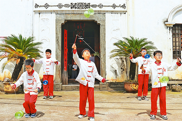6月8日上午,上溪鎮(zhèn)荷市村文化禮堂里不時傳來歡聲笑語。來自吳店小學的7名學生身著傳統(tǒng)服飾,現(xiàn)場展示了精彩的空竹表演,贏得了一片叫好聲。