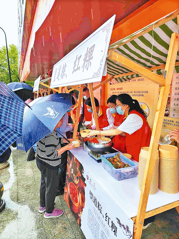 活動(dòng)現(xiàn)場,除展示“百縣千碗”美食圖文外,受邀的義烏大酒店工作人員為群眾制作了東河肉餅、上溪牛雜湯、望道紅糖粽、丹溪醉核桃等“百縣千碗”義烏特色美食。這些特色美食也被稱為“義烏十碗”,食物的“鮮”賦予了義烏的美,每一口滋味蘊(yùn)藏著人們割舍不了的鄉(xiāng)愁?!袄习?,給我6個(gè)東河肉餅”“給我來一碗核桃羹”……盡管當(dāng)天雨水不斷,市民參與的熱情依然高漲。