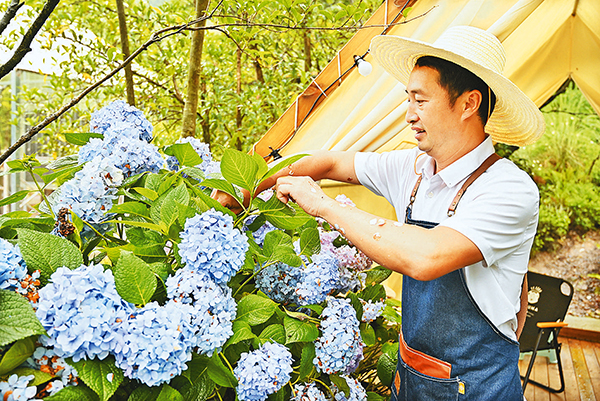 基地里面的繡球花海就來源于全家的喜愛?!拔覀兗依锶吮容^喜歡養(yǎng)花,所以我就在露營基地里面種了不少繡球花,然后把它與帳篷結(jié)合,打造出一個攝影打卡機位?!备嫡袢A說,繡球花讓露營基地一下子成了網(wǎng)紅打卡地。很多年輕女孩子慕名前來,直奔露營基地里的繡球花海。